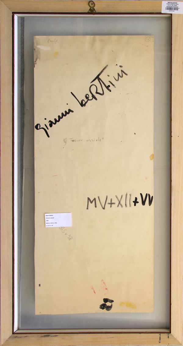 Firma, titolo, scritta, dimensioni "Gianni Bertini, Tensione assiale, MV+XII+VV, 87,5x38" (al retro)