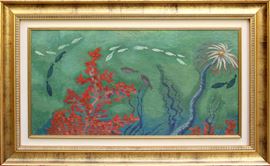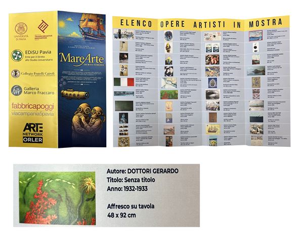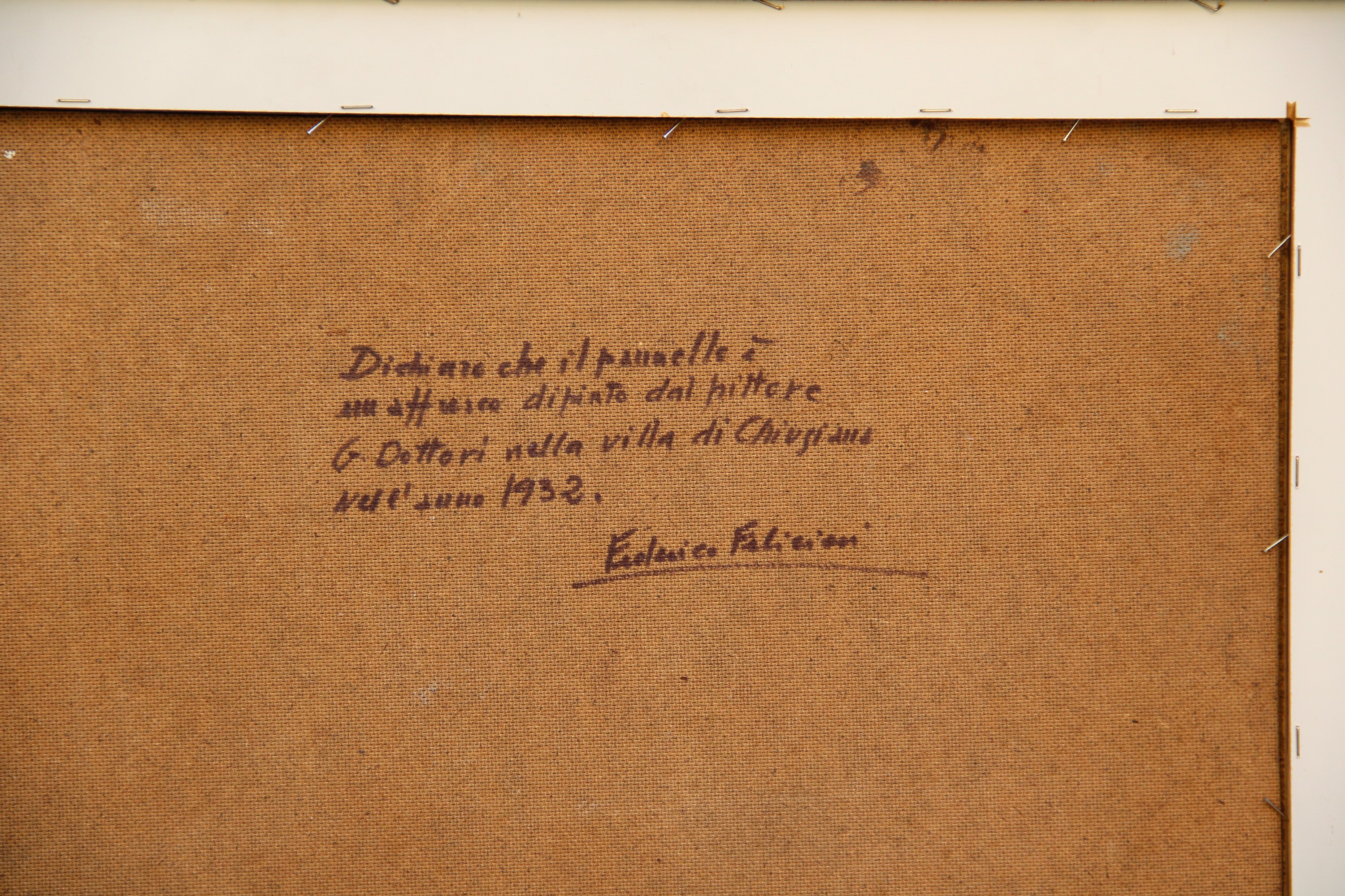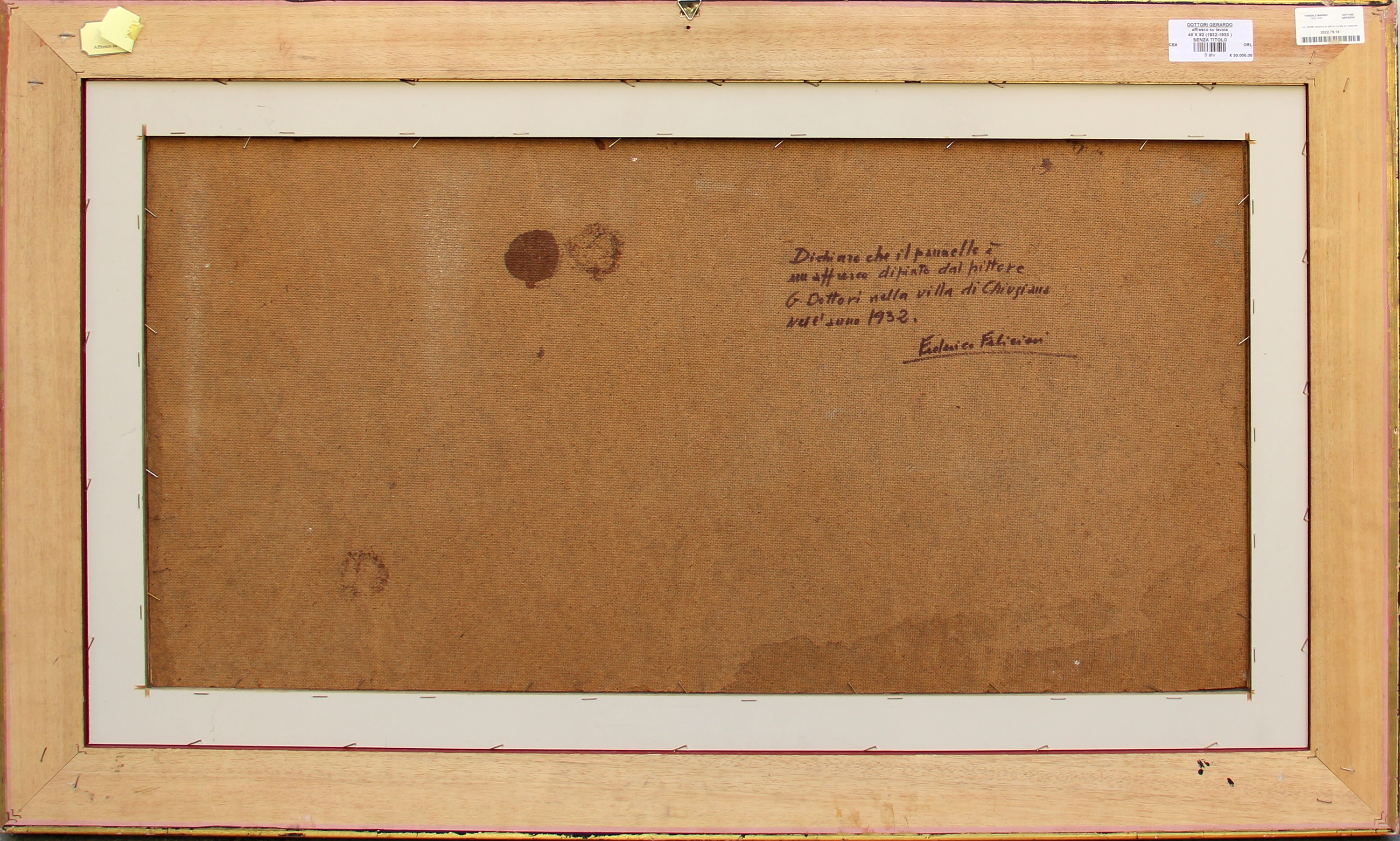 Dichiarazione di autenticità a cura di Federico Felicioni "Dichiaro che il pannello è un affresco dipinto dal pittore G. Dottori nella villa di Chiugiana" (al retro)