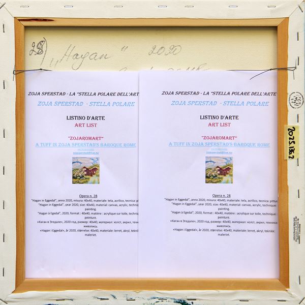 Titolo, data, dimensioni, tecnica, firma "Hagan, 2020, 40x40, acrylic, Zoja Sperstad" (al retro)