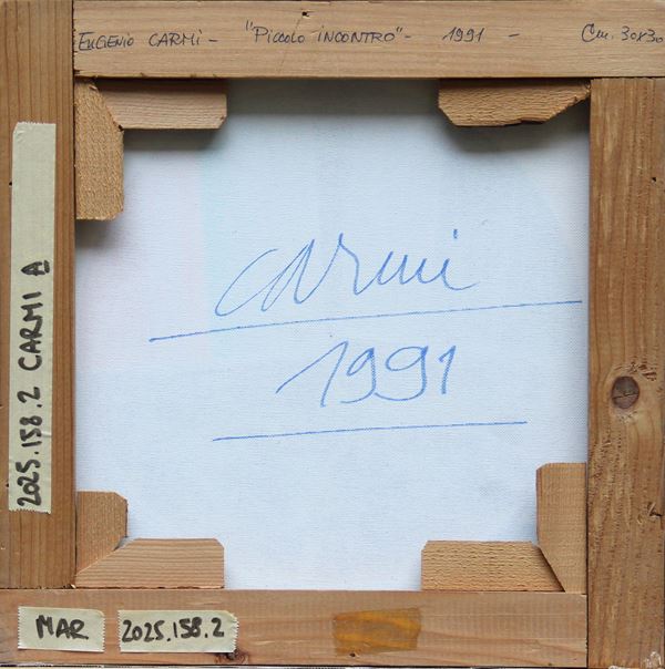 cm 30x30Firma, titolo, data, dimensioni, firma, data "Eugenio Carmi, Piccolo incontro, 1991, cm 30x30, Carmi, 1991" (al retro)
