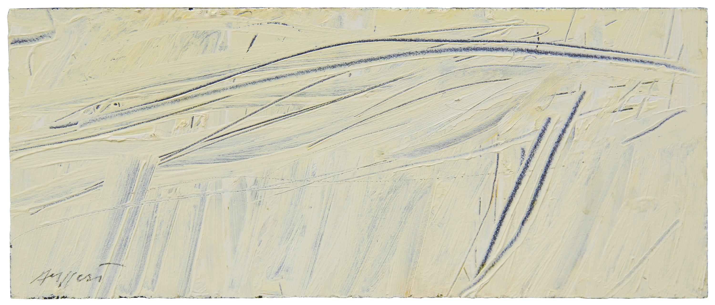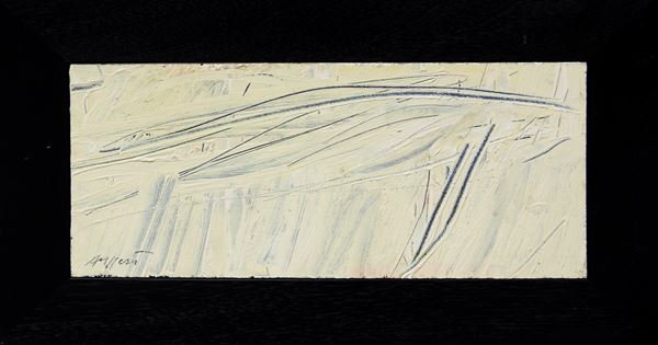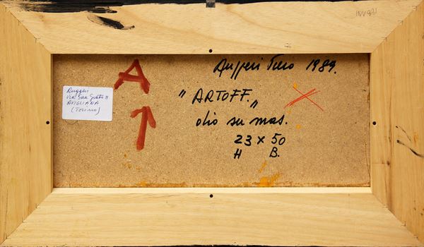 Firma, data, titolo, tecnica, dimensioni "Ruggeri Piero, 1989, Artoff, olio su mas., 23x50" (al retro)