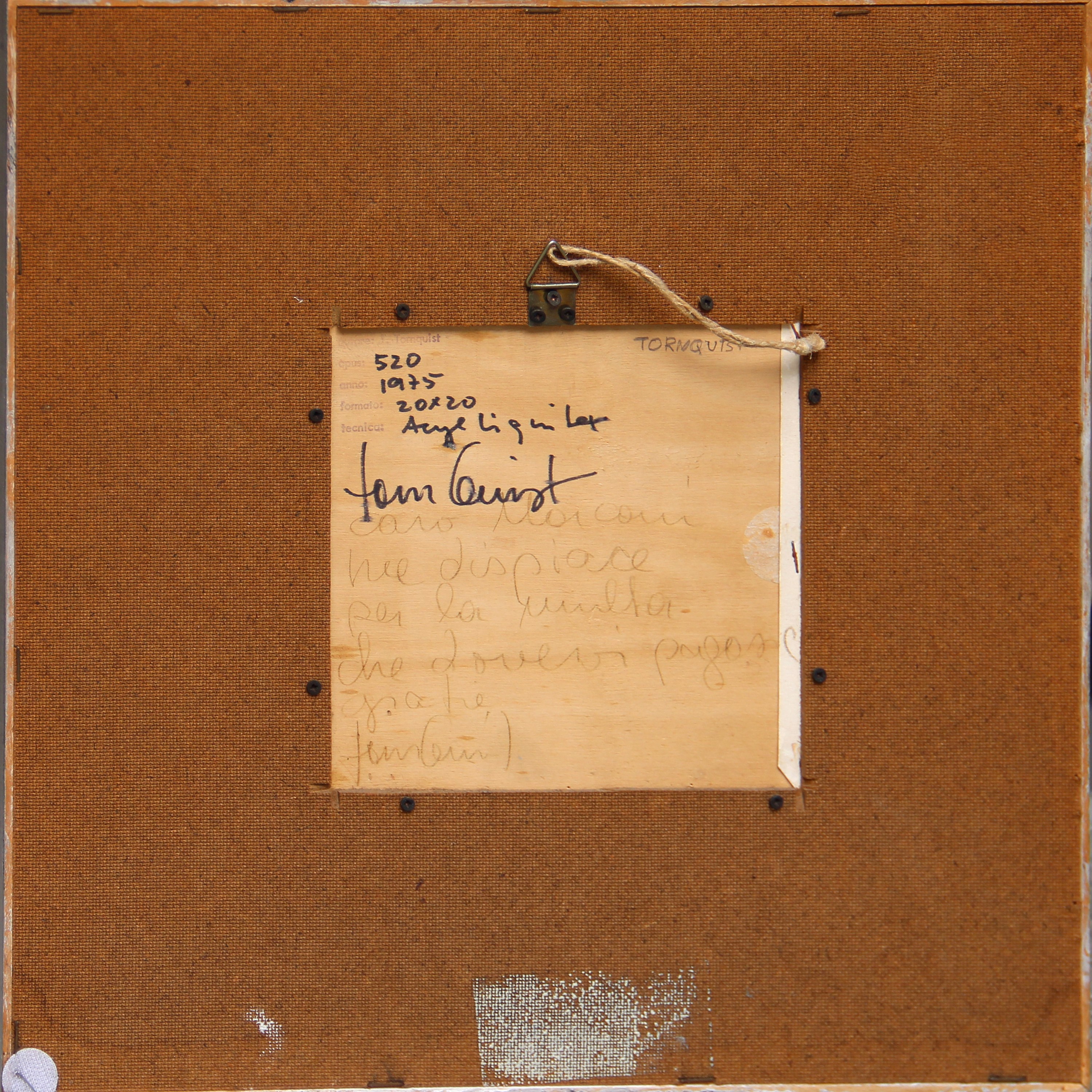 cm 20x20Titolo, data, dimensioni, tecnica, firma, scritta "Opus 520, 1975, 20x20, acryl liquitx, Tornquist";