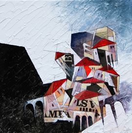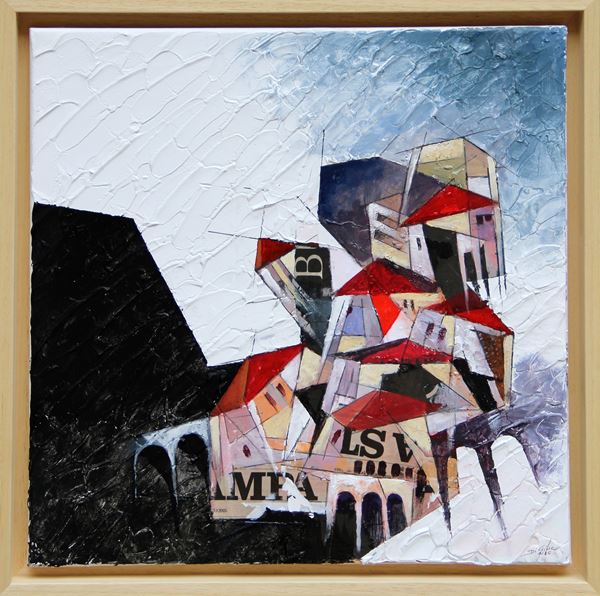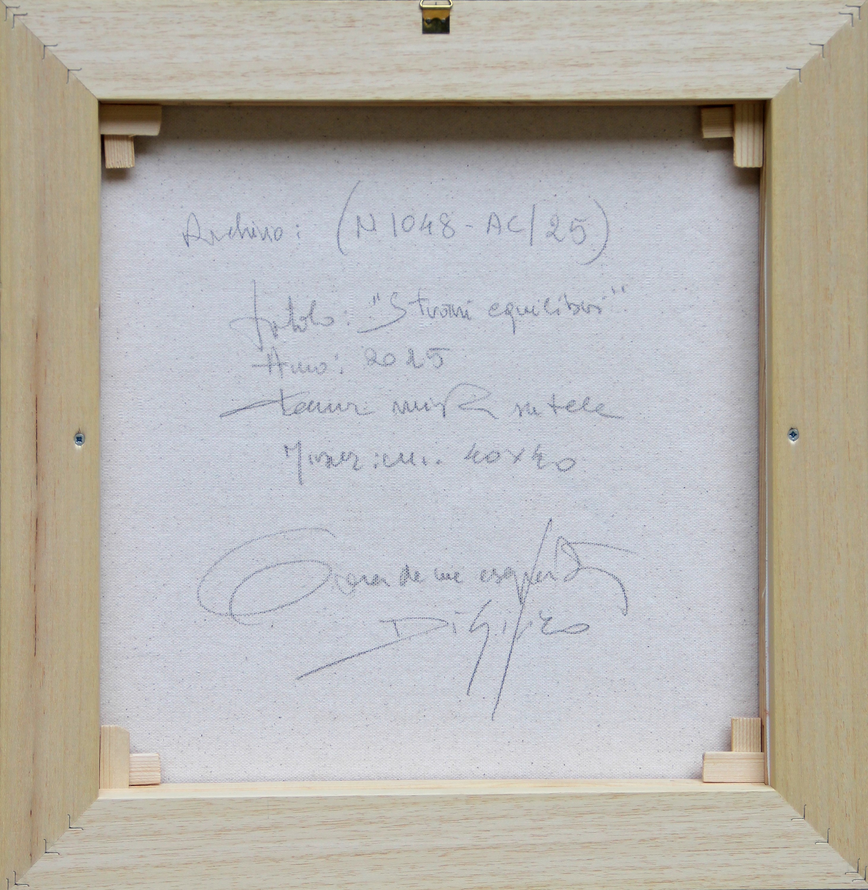 Numerazione, titolo, data, tecnica, dimensioni, firma "N 1048-AC/25, Strani equilibri, 2025, cm 40x40, Di Gifico" (al retro)