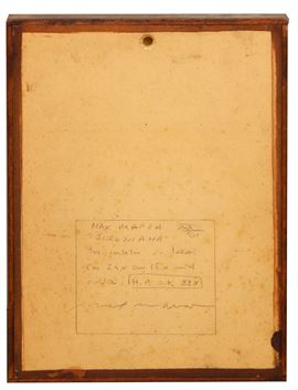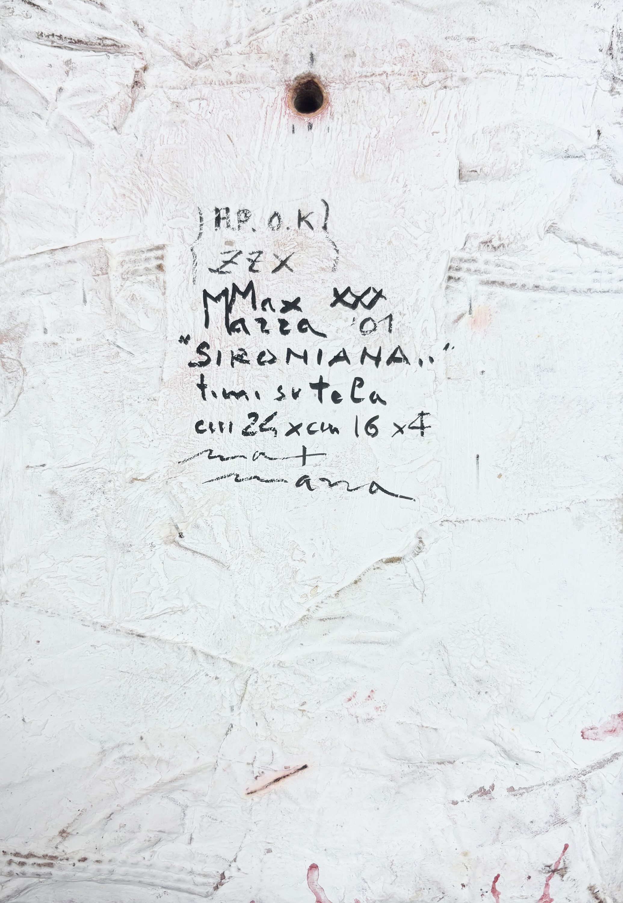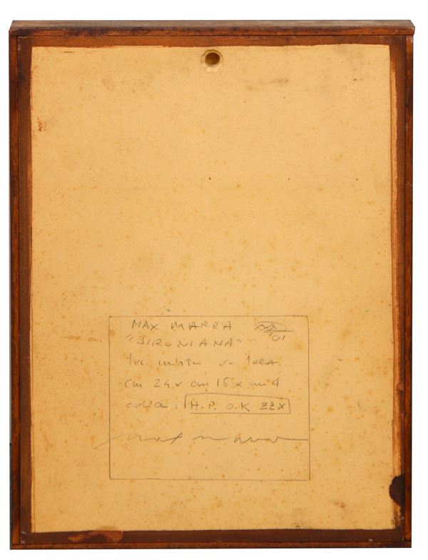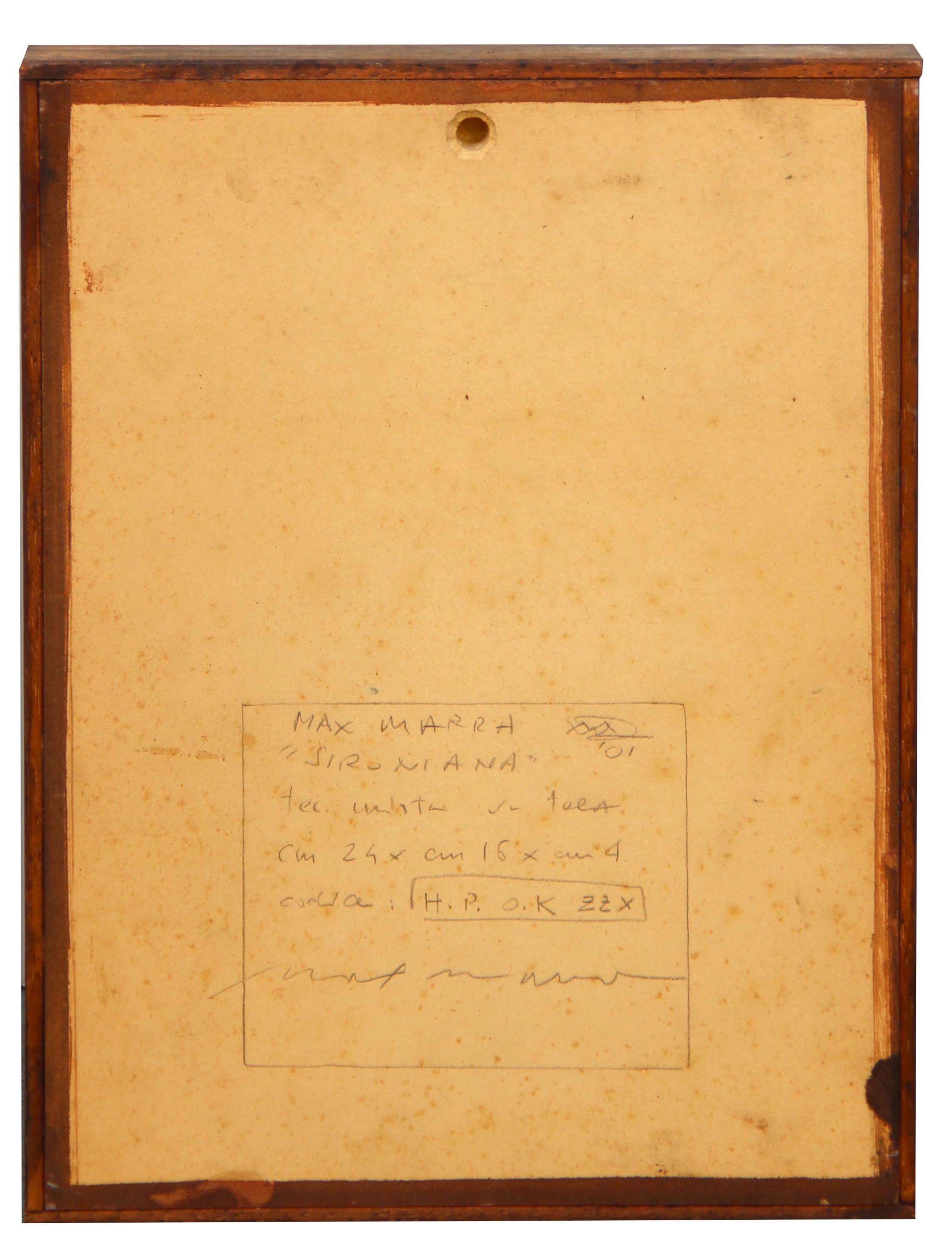 Firma, titolo, data, tecnica, dimensioni, numerazione, firma "Max Marra, Sironiana, 01, tecnica mista su tela, cm 24x16x4, codice: H.P. O.K ZZX" (al retro)