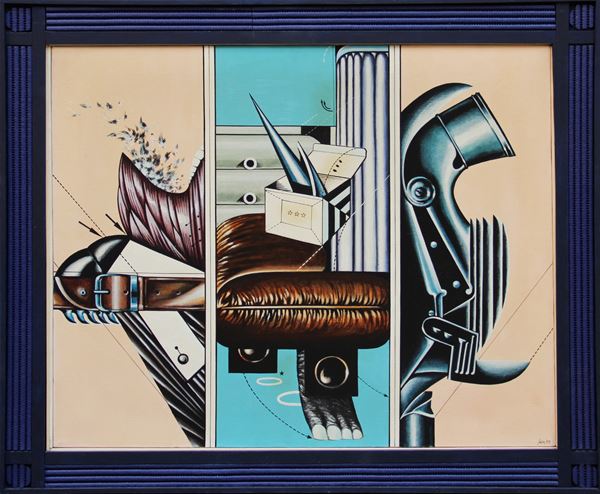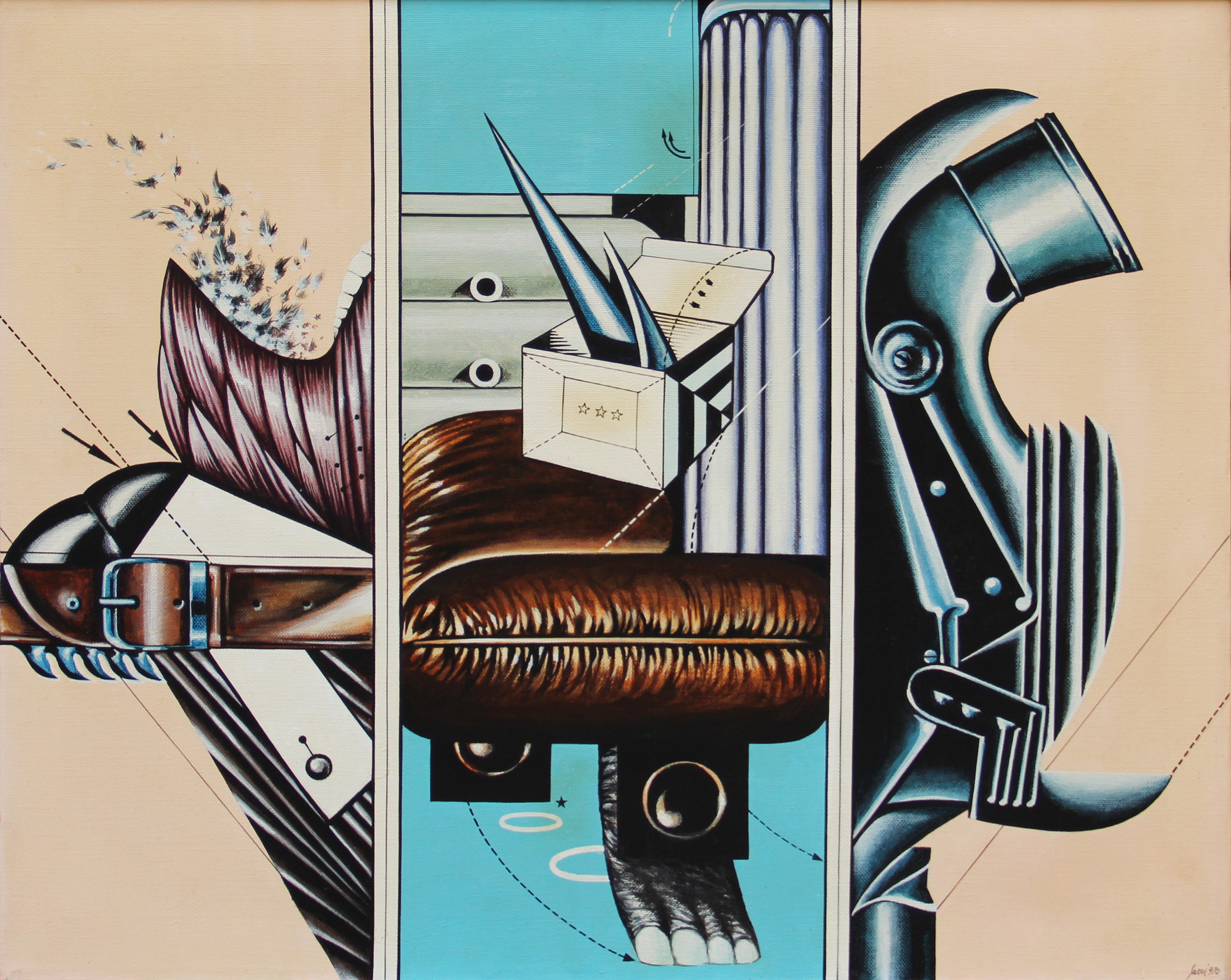 Titolo, dimensioni, firma, data "Interno-persona-oggetto (L'uomo di piume), cm 80x65, S. Sarri, 1970"