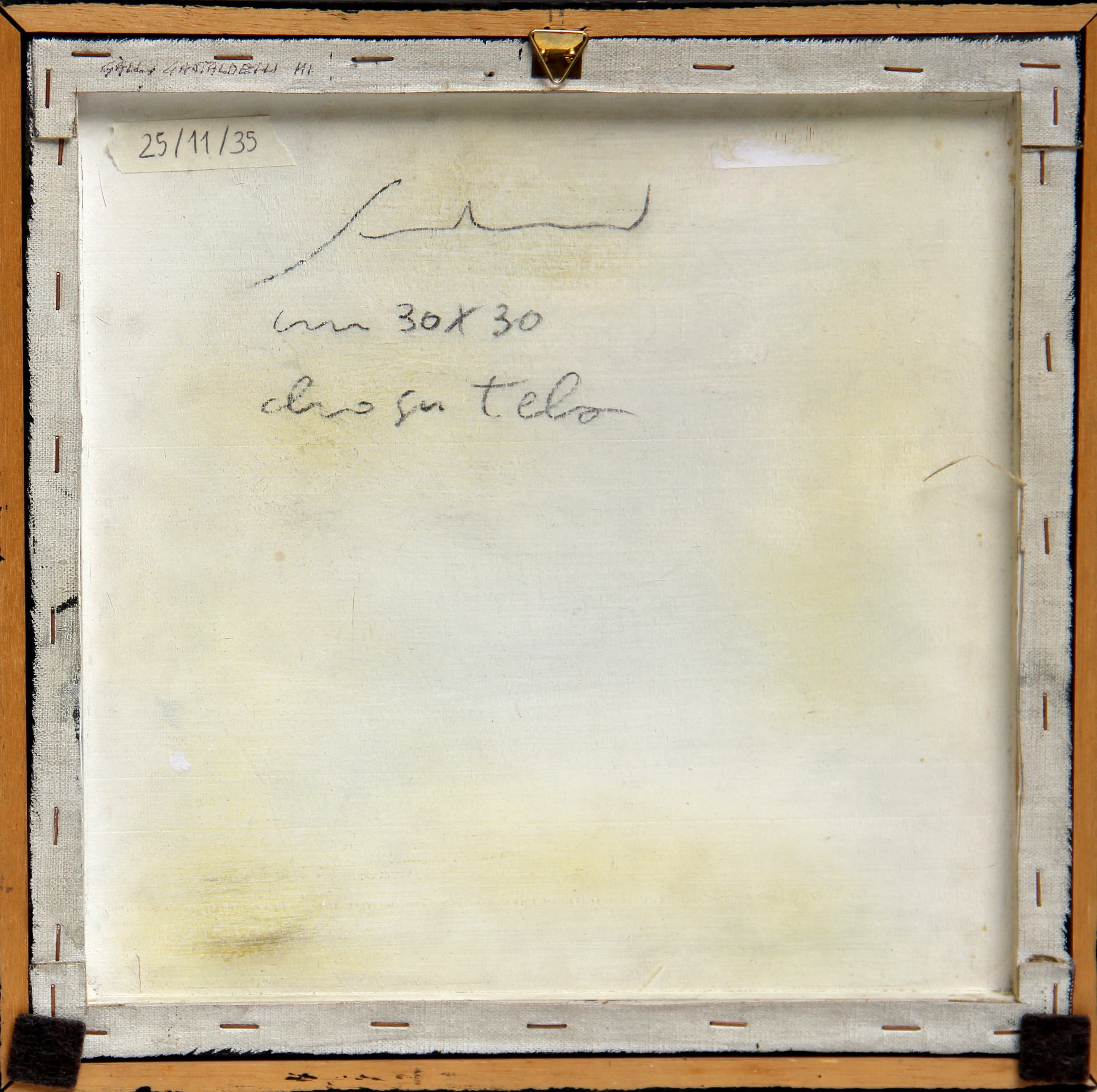 Firma, dimensioni, tecnica "Scanavino, cm 30x30, olio su tela" (al retro)