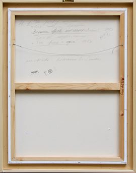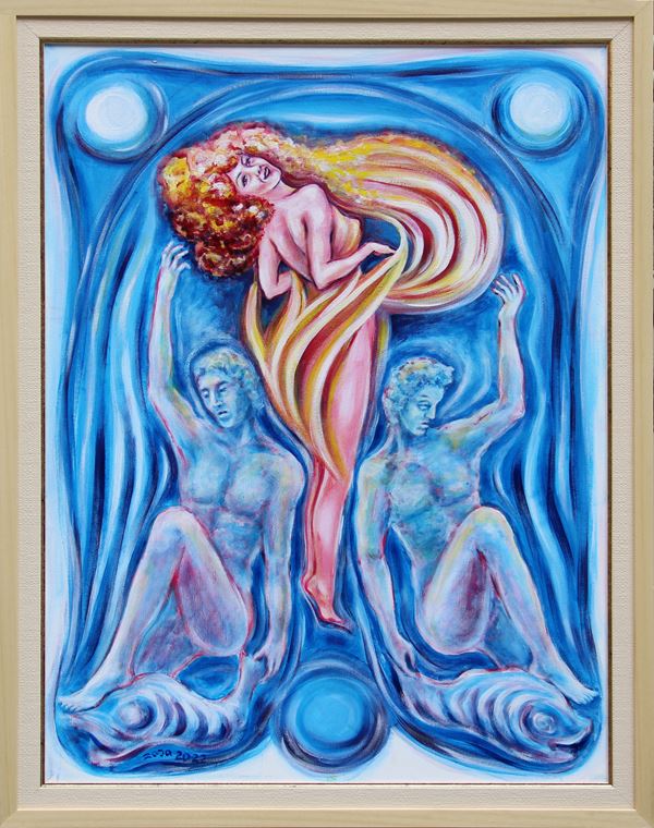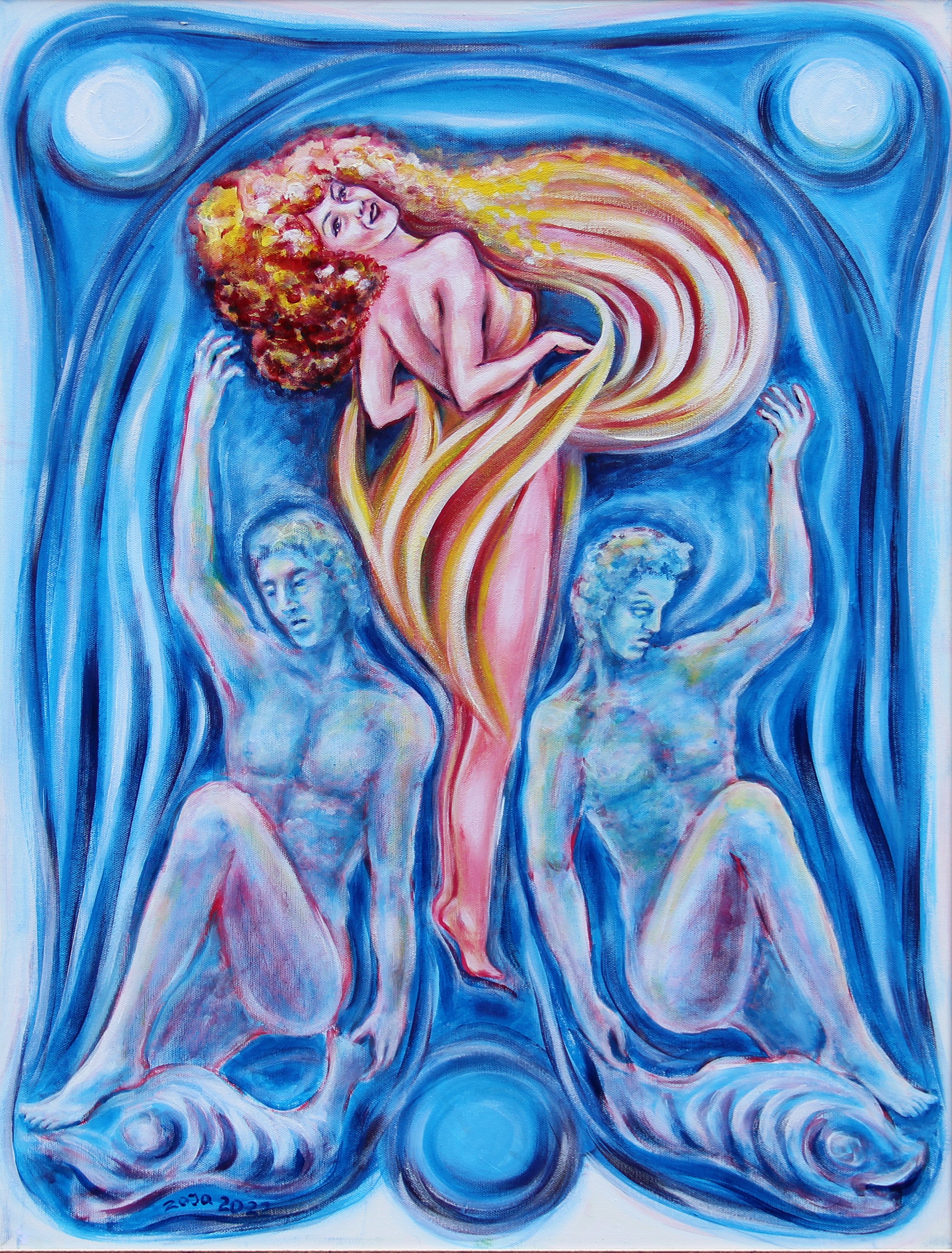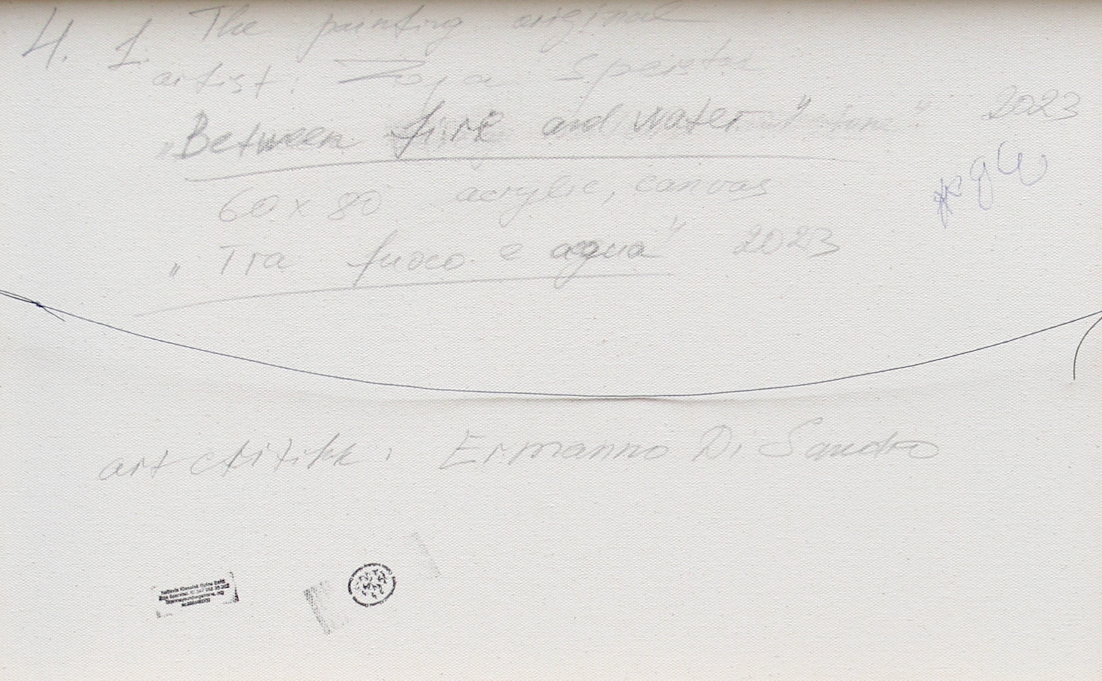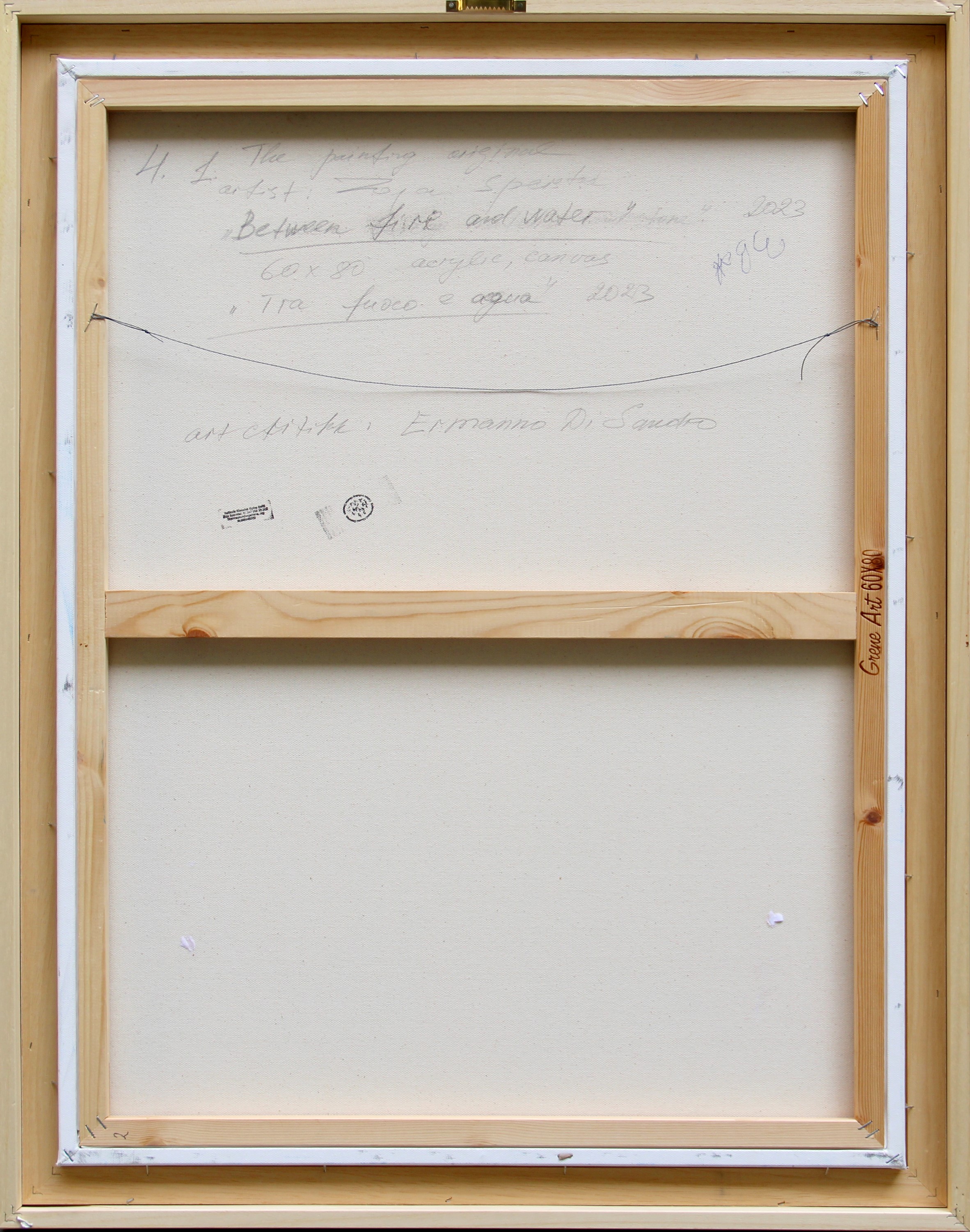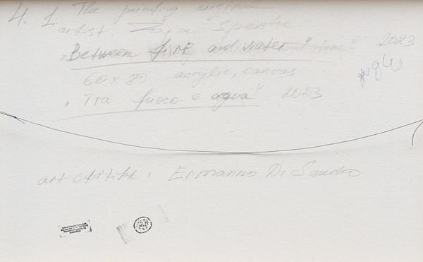 Scritta, firma, titolo, misura, tecnica, data, scritta "The painting original, artist: Zoja Sperstad, Between fire and water, 60x80, acrylic, canvas, Tra fuoco e acqua, 2023, art critic: Ermanno Di Sandro" (al retro)