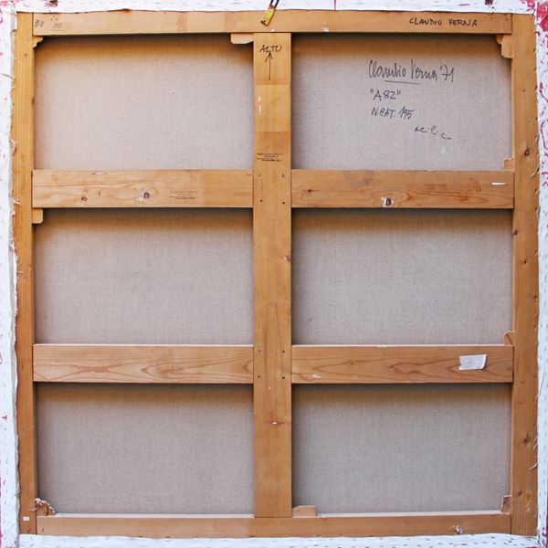 cm 150x150Firma, data, titolo, numerazione, tecnica "Claudio Verna, '71, A82, n. cat. 195, acrilico";