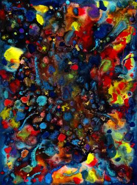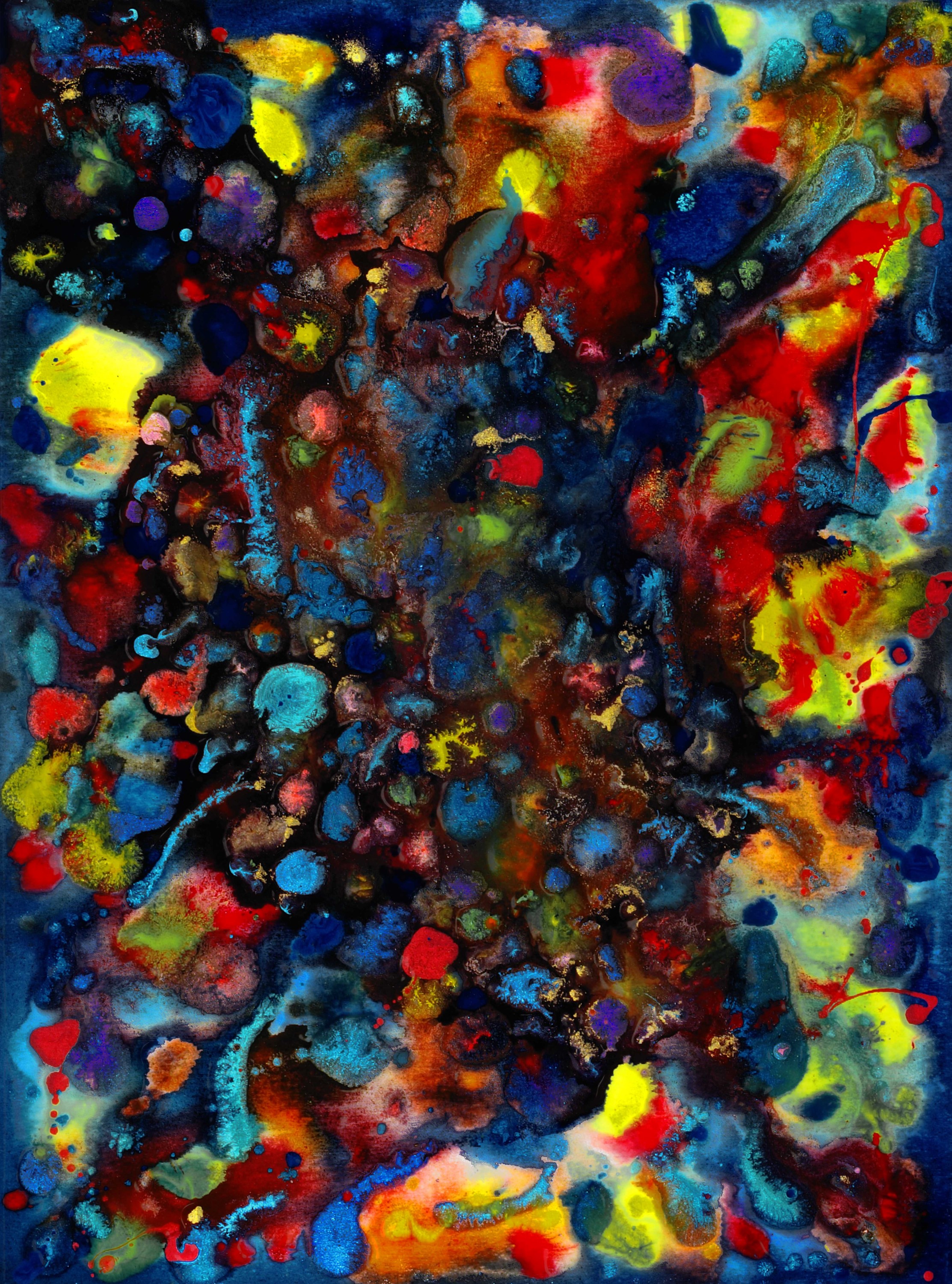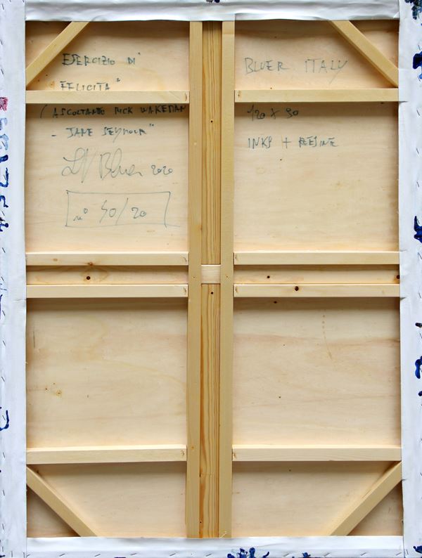 cm 120x90Titolo, firma, data, dimensioni, tecnica "Esercizi di felicità ascoltando Rick Wakeman, LV Bluer, 2020, 120x90, inks+resine" (al retro)