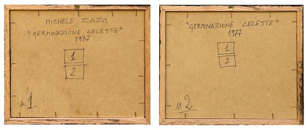 Firma, titolo, data, numerazione "Michele Zaza, Germinazione celeste, 1977, n. 1" (al retro)